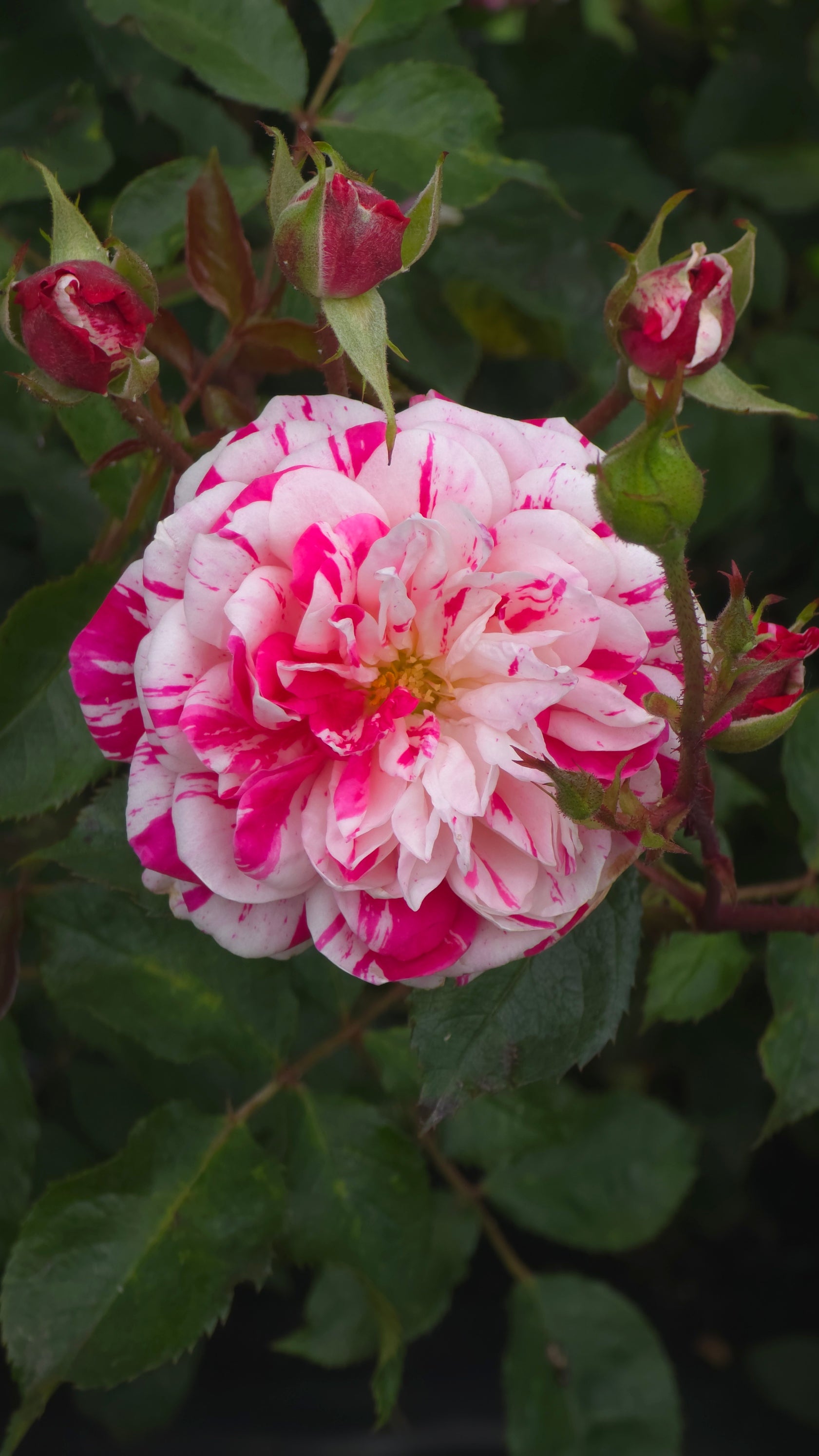 A unique patio climber featuring multi petal blooms of striped pink on creamy-white. Lovely dark green foliage.